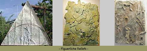 Das Relief, die Kunstrichtung zwischen Bild und Skulptur, hat eine sehr alte Tradition und beinhaltet viele Tuecken aber auch viele Reize. Meine figuerlichen Reliefs zeigen Menschen in einer Umgebung, stellen Situationen dar oder erzaehlen Geschichten. Die meisten sind aus Gips und wurden zum Teil mit anderen Materialen kombiniert. Die Reliefs koennen auch in Bronze gegossen werden.